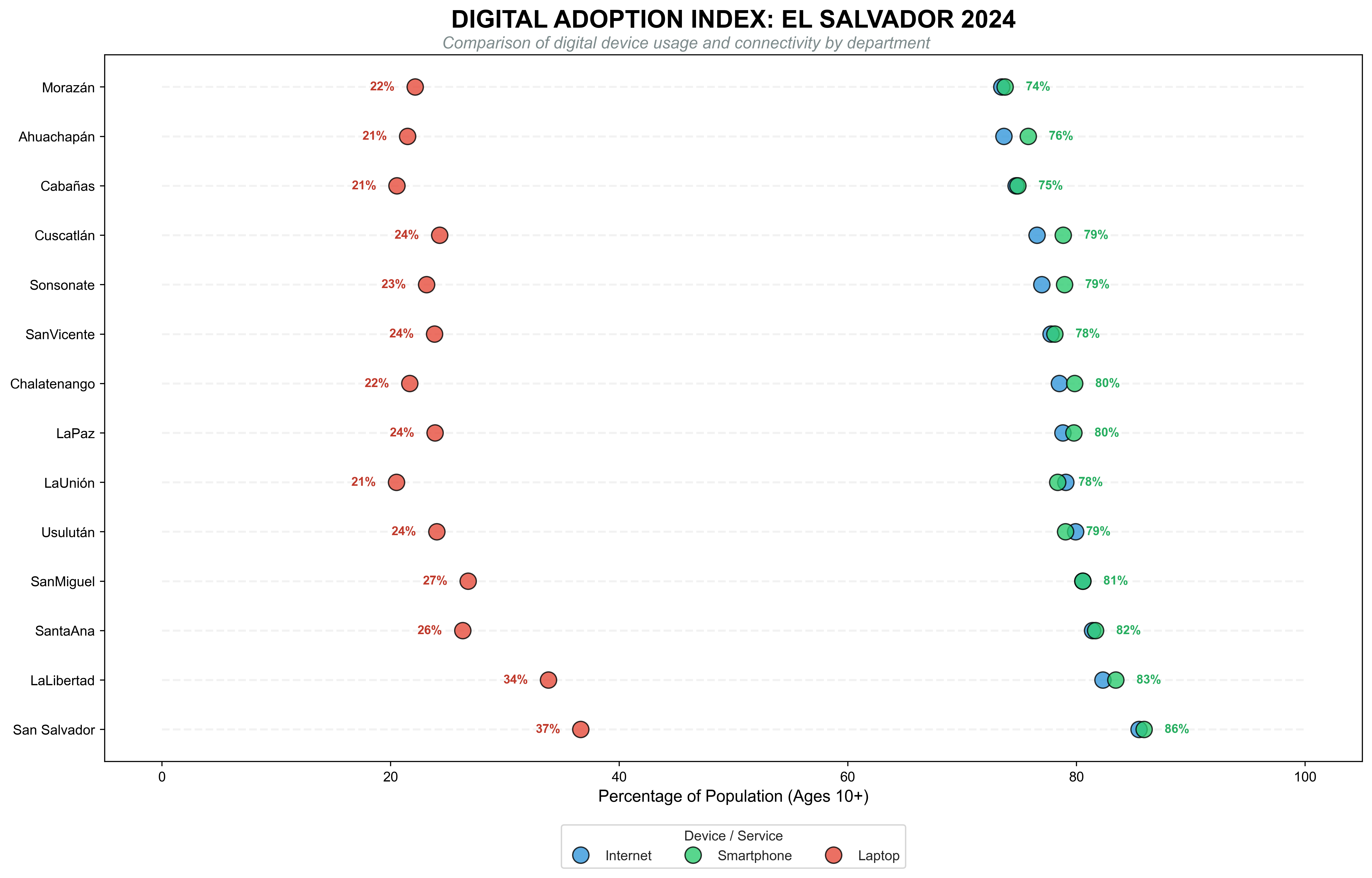 While internet access exceeds 70% in most departments, a critical gap remains in personal computer (laptop) ownership. This disparity suggests high digital consumption via smartphones, but poses a challenge for desktop-based productivity and specialized technical work.