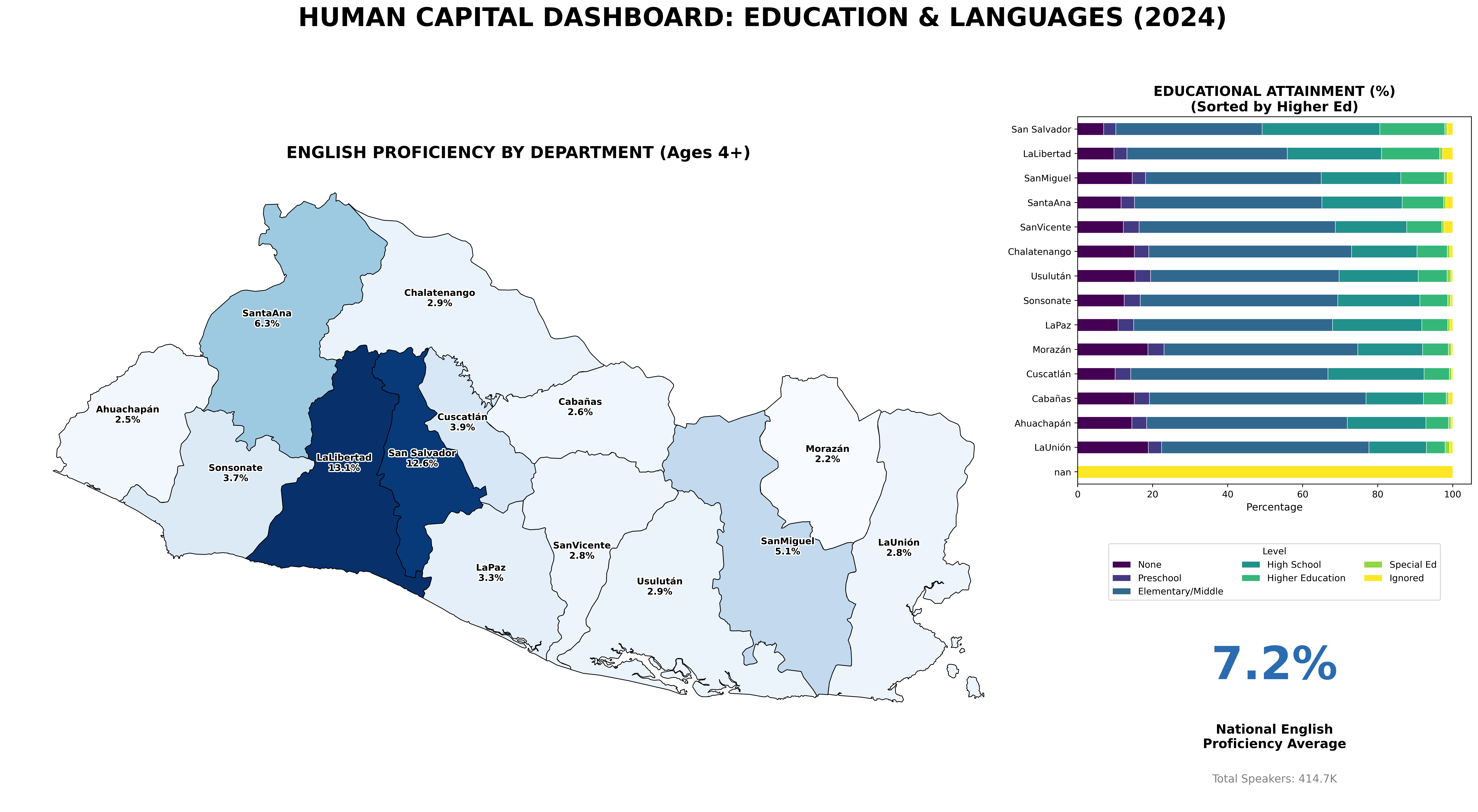 Human capital is the engine of economic development. This analysis reveals a clear correlation between access to higher education and English language proficiency, highlighting San Salvador and La Libertad as the primary hubs for highly skilled talent.