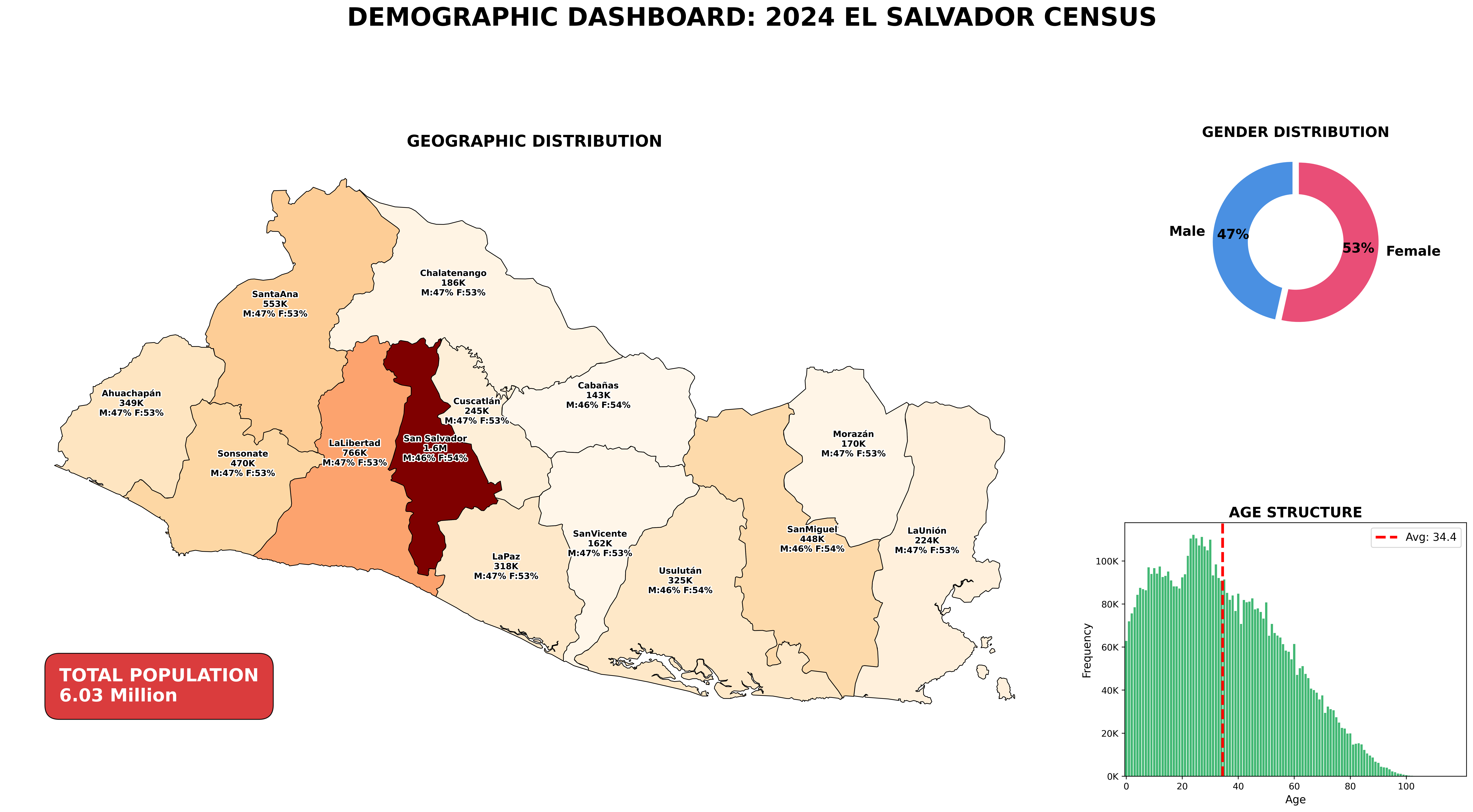 El Salvador’s population stands at 6.03 million, with a significant concentration in the country’s central region. The following dashboard details the geographic distribution by department, gender composition, and age structure (population pyramid).